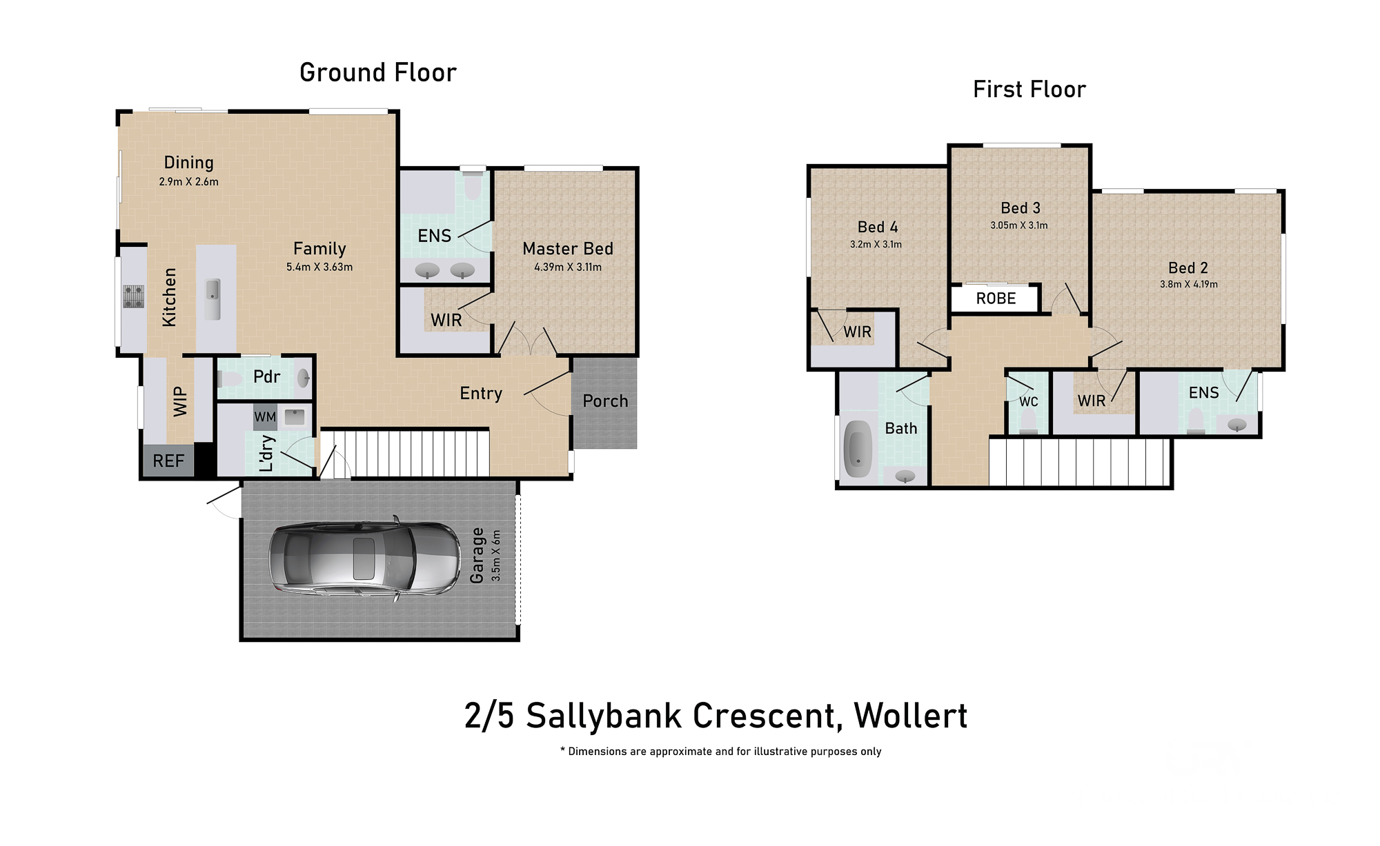 The versatile floorplan includes a convenient guest bedroom with its own ensuite on the ground floor-perfect for visitors or multi-generational living. Upstairs, the master bedroom features a walk-in robe and private ensuite, while two additional bedrooms with built-in robes share a central bathroom. All bathrooms are finished with elegant floor-to-ceiling tiling, adding a touch of luxury and enhancing ease of maintenance.