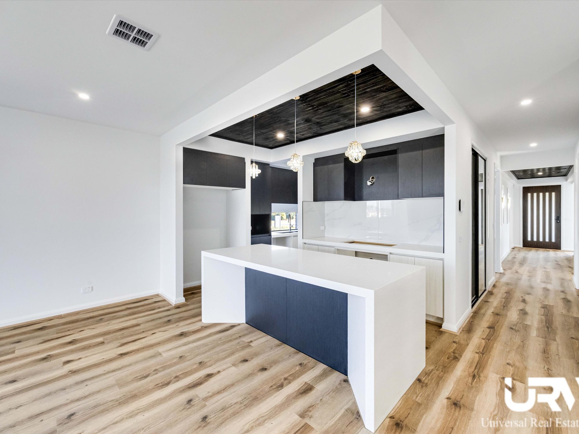 - KITCHEN: Stunning 60mm stone waterfall benchtop, premium 900mm appliances, soft-close drawers, tiled splashback, rangehood, electric oven, bulkheads, pendant lights, double-door fridge cavity, and a spacious butler's pantry
