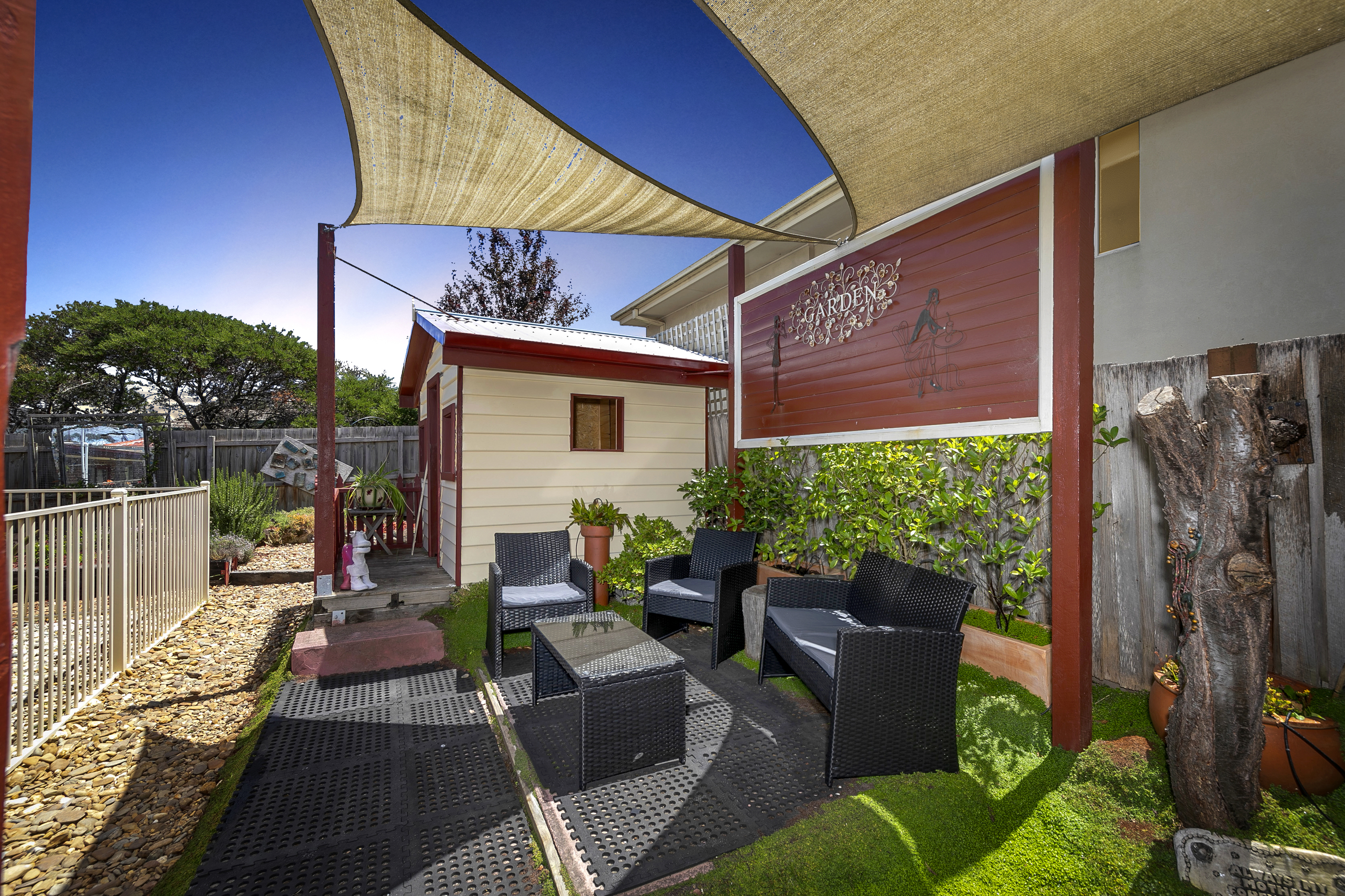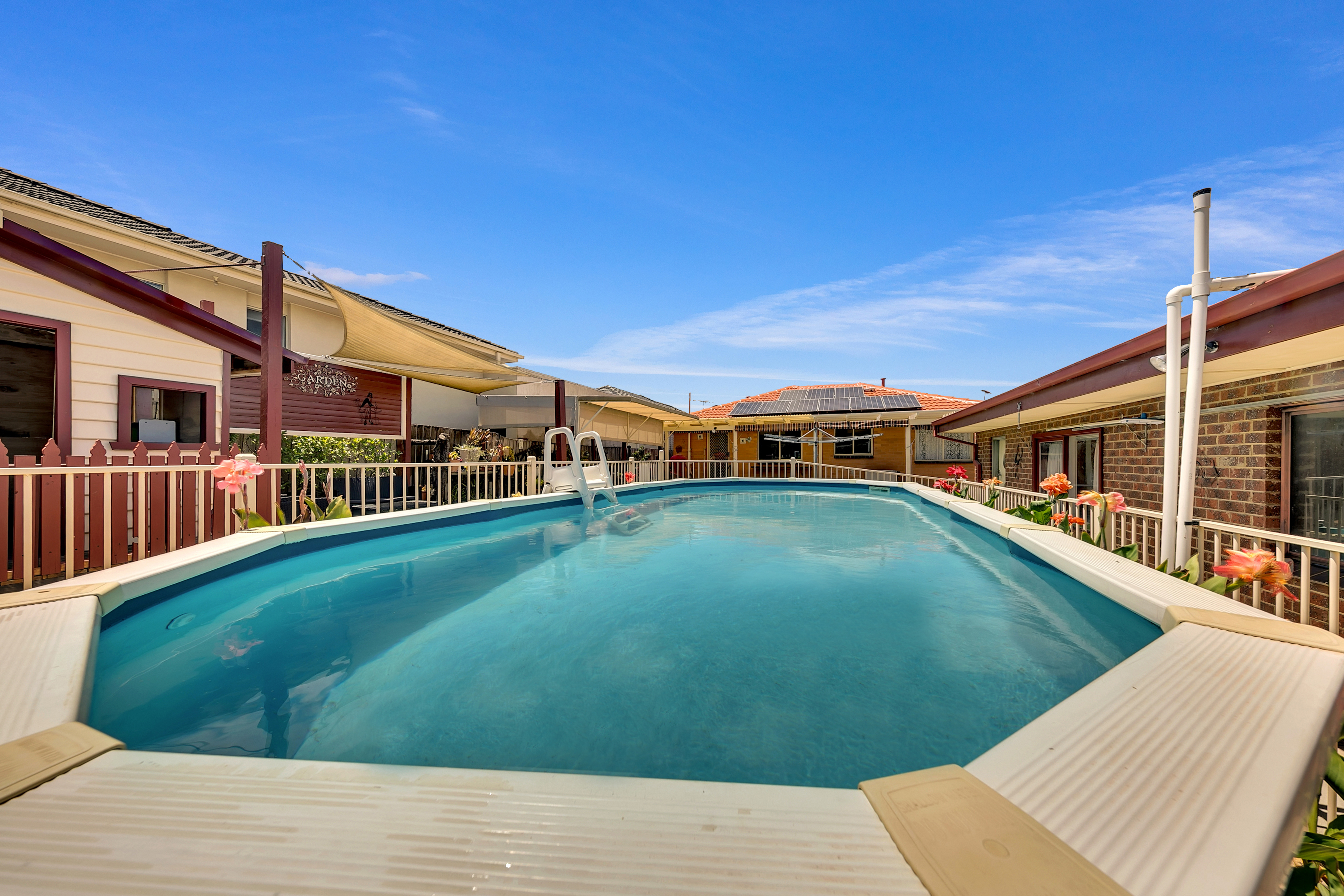 - BACKYARD: Entertainment with Outdoor Sitting Area, Overlooking Swimming Pool with Solar Heating, Veggie Garden Beds and Irrigation/ Mist System.