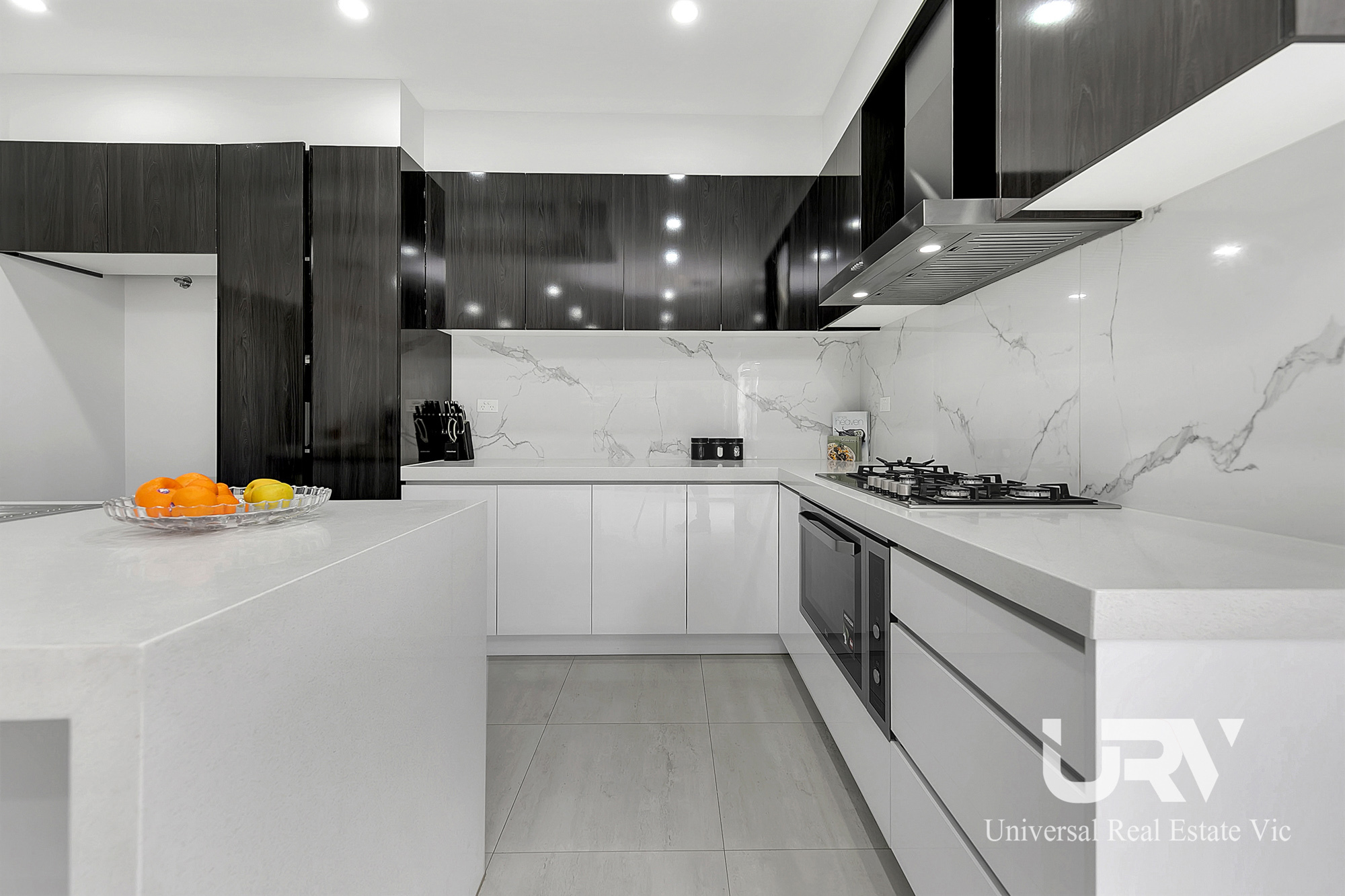 - KITCHEN: Spacious Open Plan Living/ Dining Kitchen with 900 mm Stainless Steel Appliances, Water fall design stone benchtops, Electric Oven, Dishwasher, Double Fridge space with plumbing. Tiled splashback and Quality build cupboards