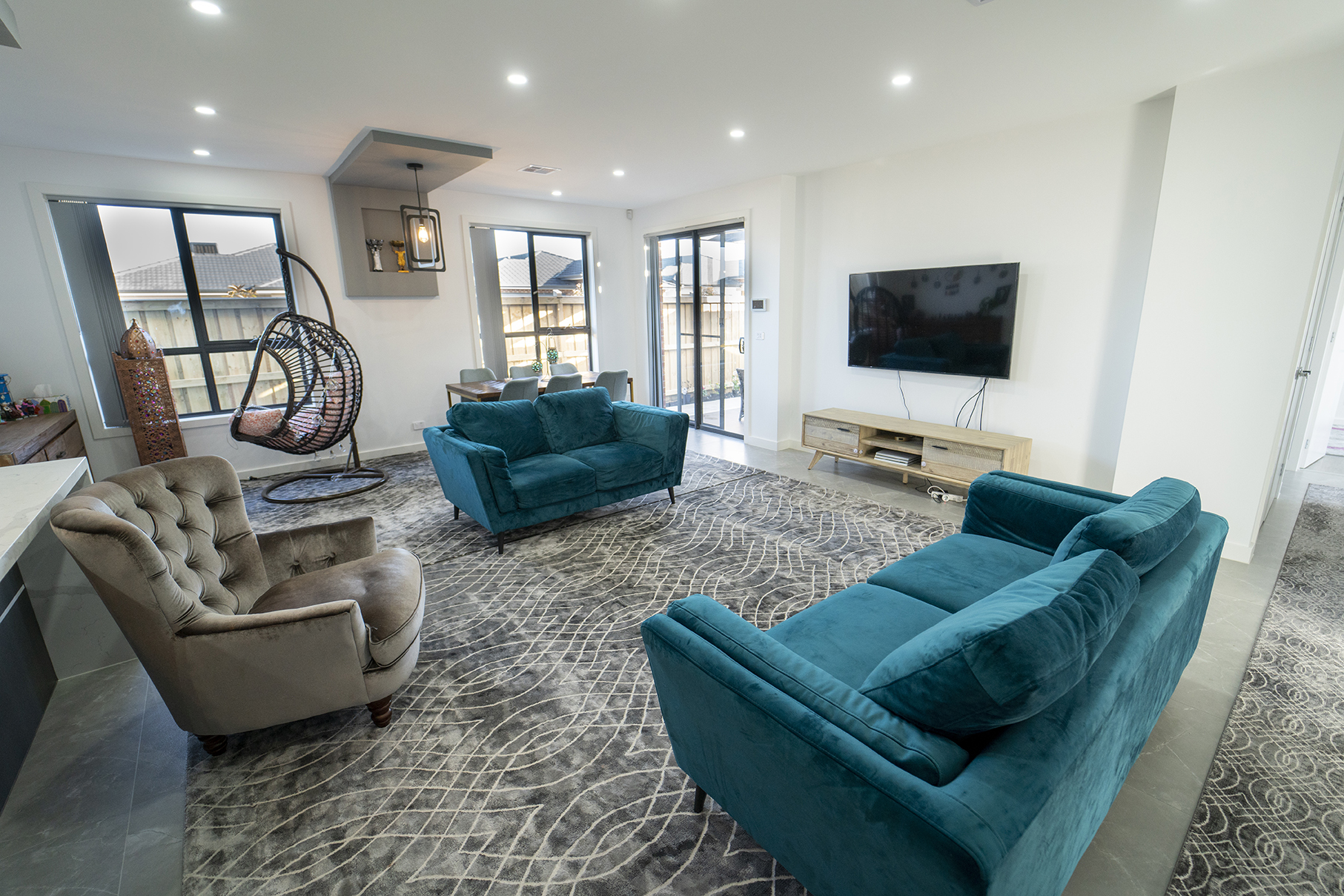 - LIVING AREAS: Formal lounge; open living area with designer bulkhead.