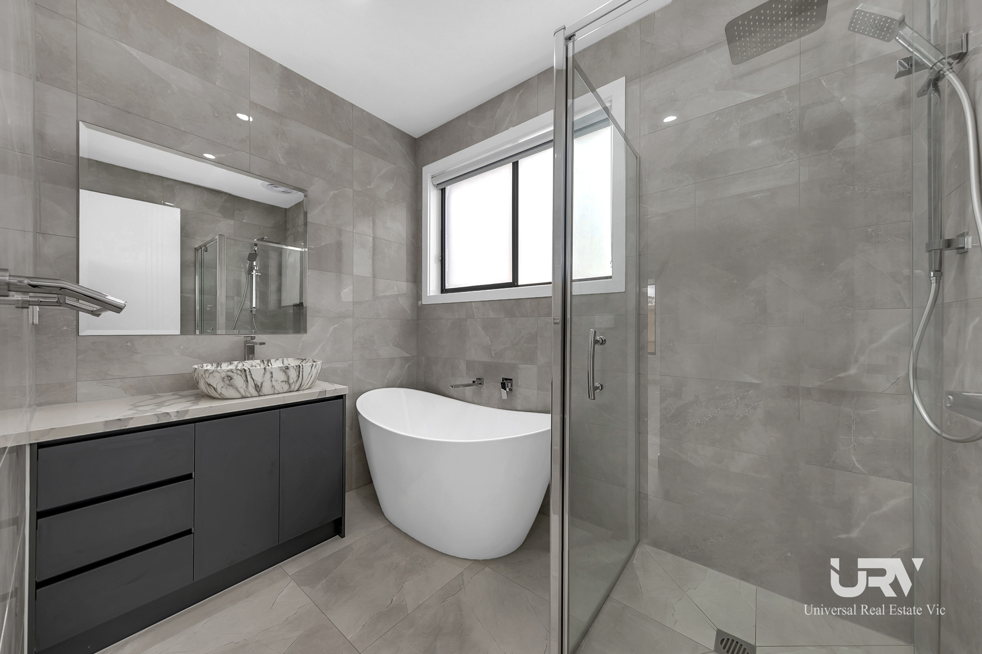 - CENTAL BATHROOM: Tiled Shower base with Freestanding Bath and Stone Benchtop.