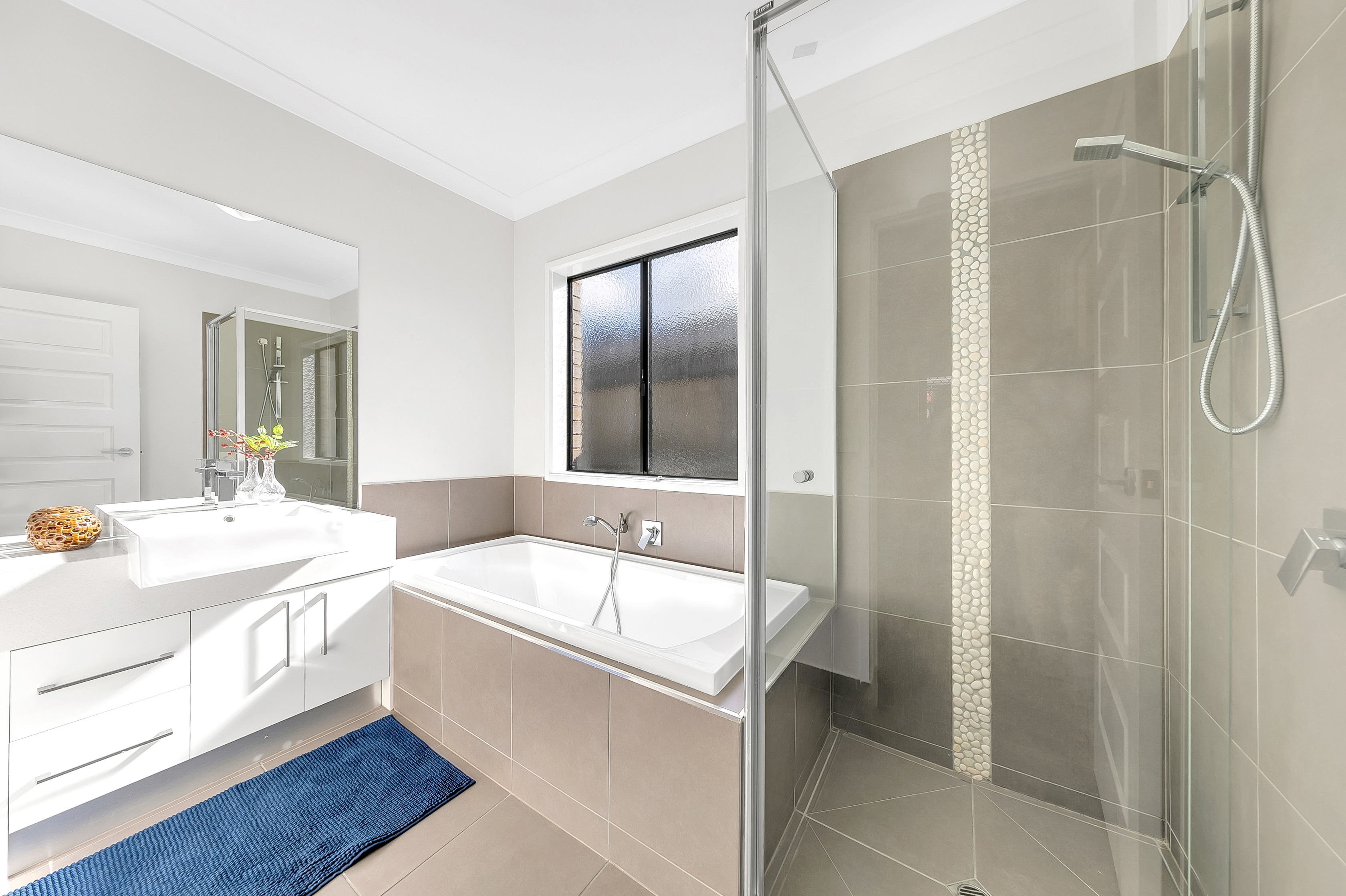 - CENTAL BATHROOM: Shower, Bathtub, Vanity with stone benchtop and a separate toilet.