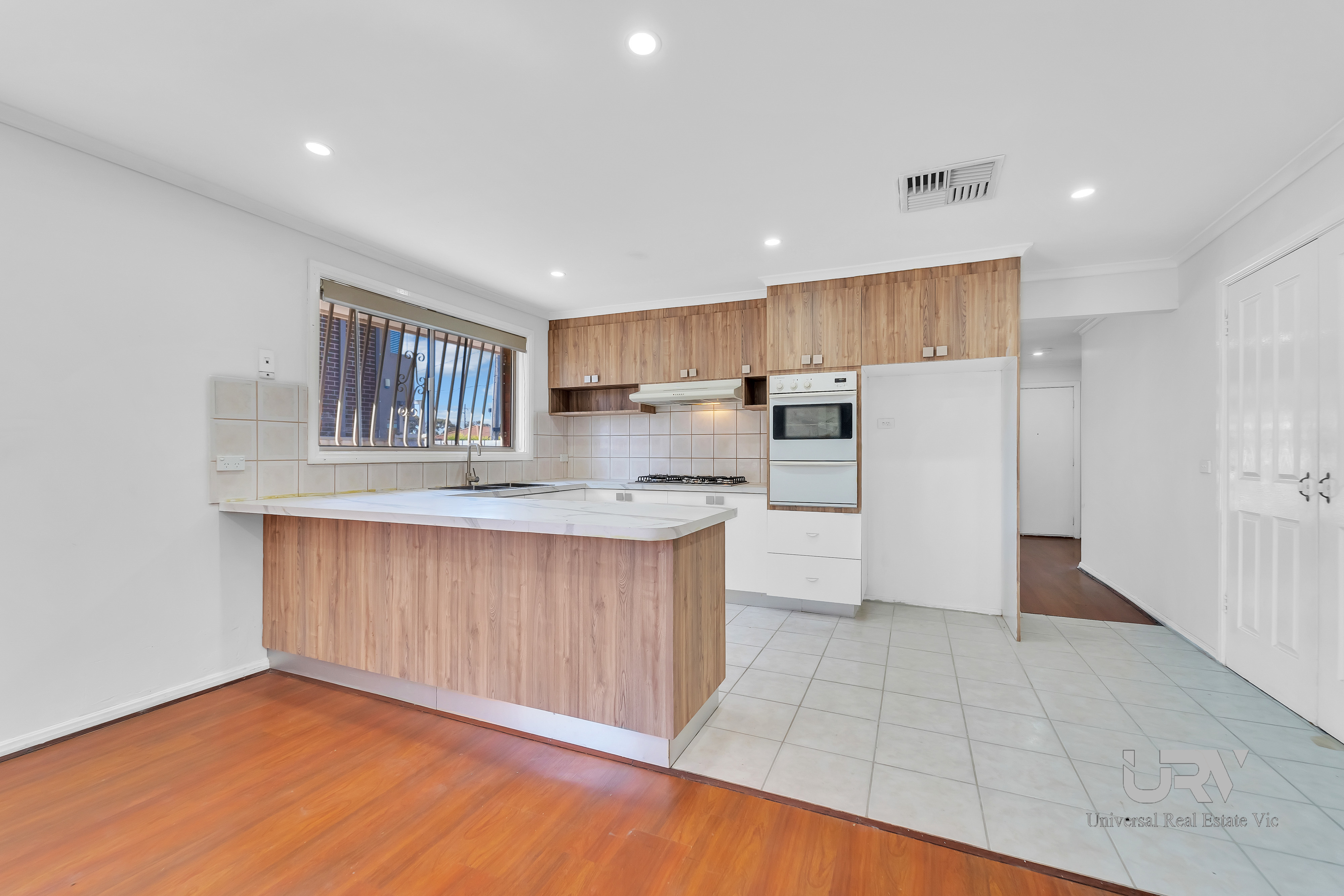 - KITCHEN: Laminated benchtop, 900mm Westinghouse cooktop (Brand New), wall-mounted oven, double bowl sink, pantry, Ample cupboards, fridge space, overhead cupboards, and window for better sunlight.