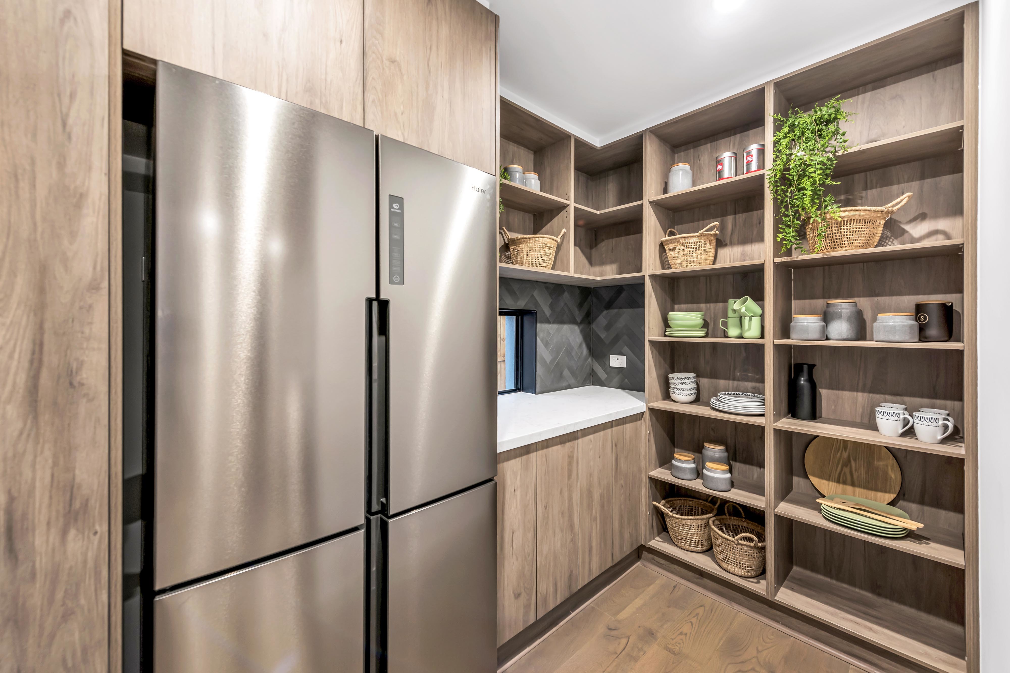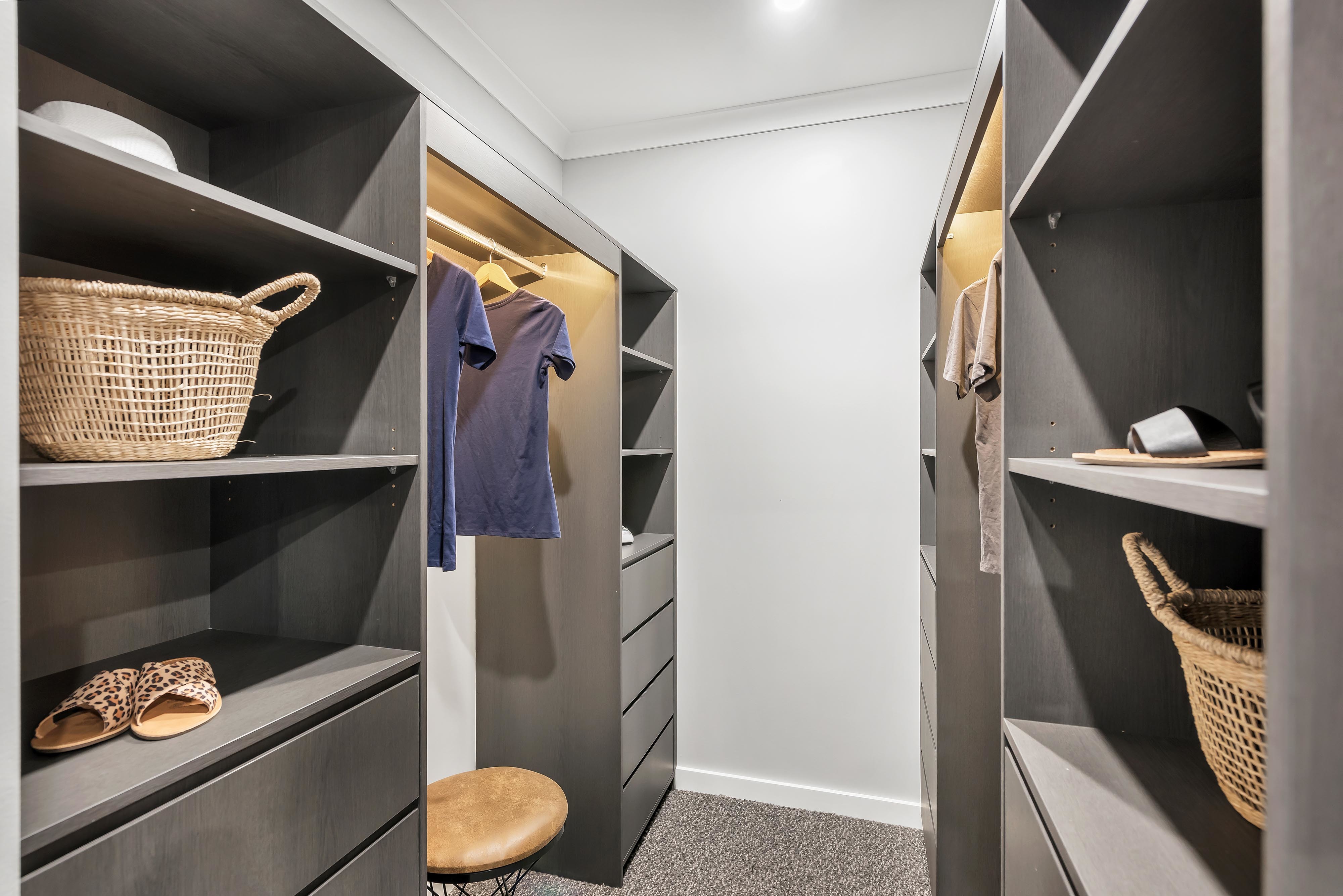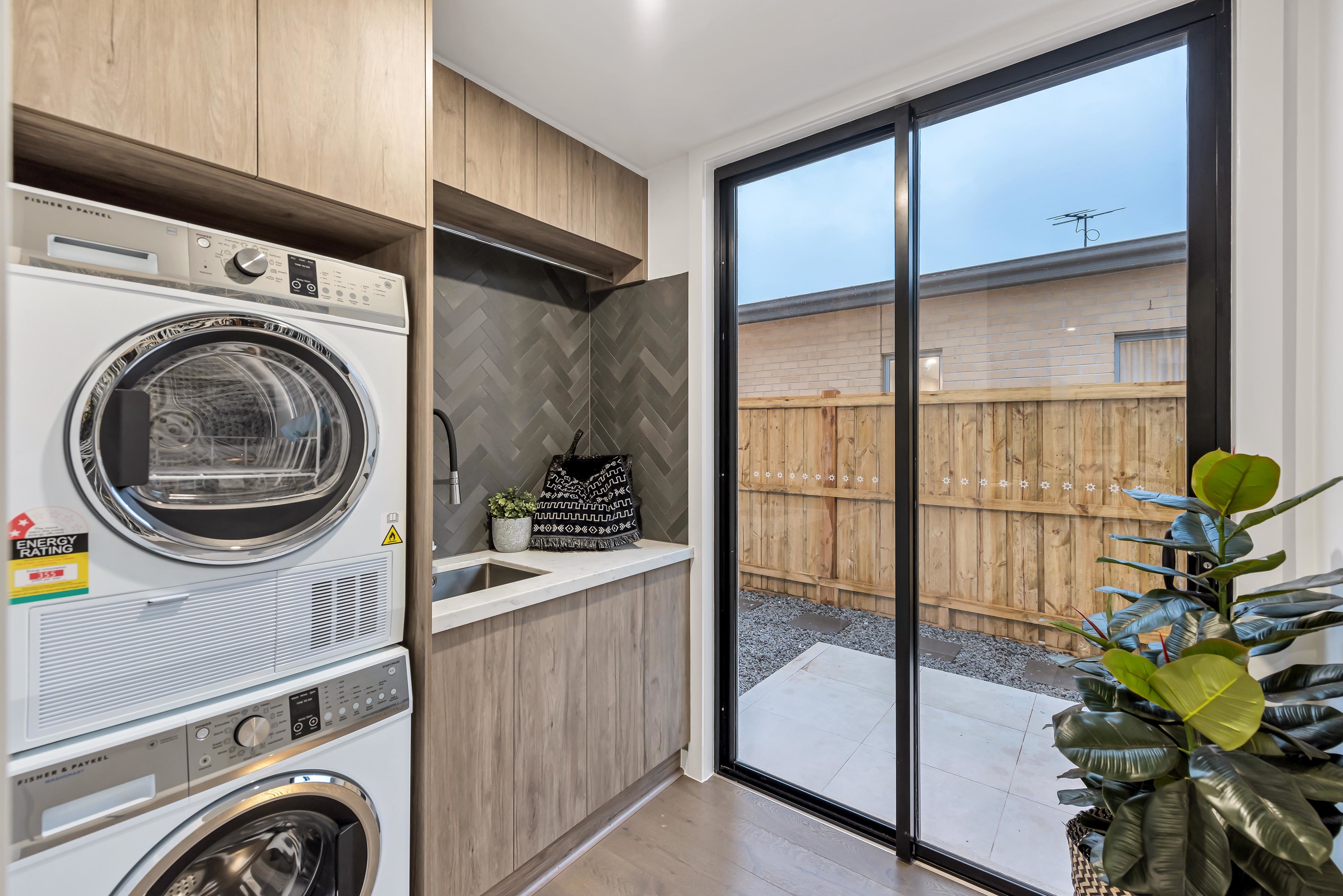 - LAUNDRY: Linen cupboard, 40mm stone bench and side access door.