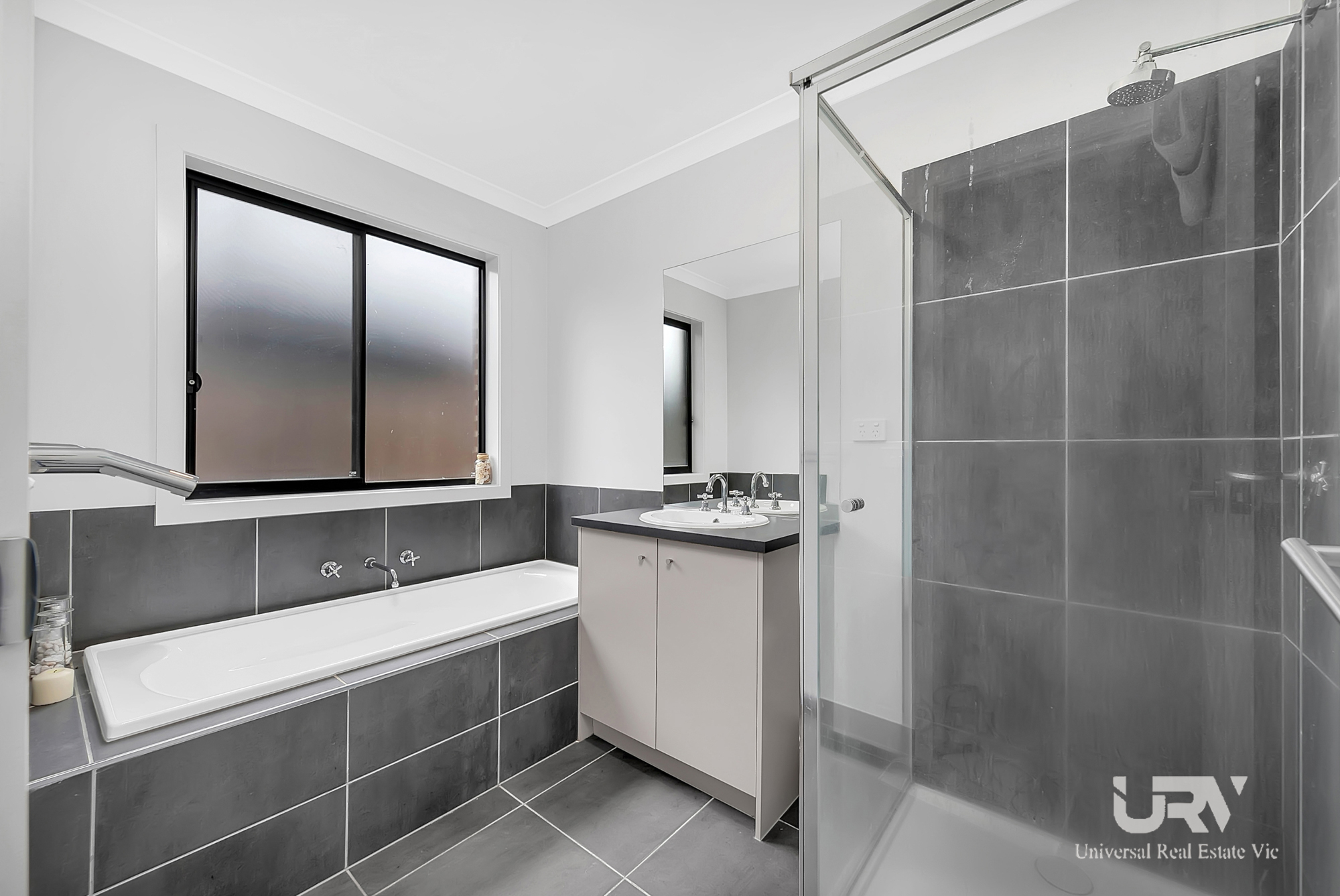 CENTRAL BATHROOM: Modern bathroom with stone benchtop.