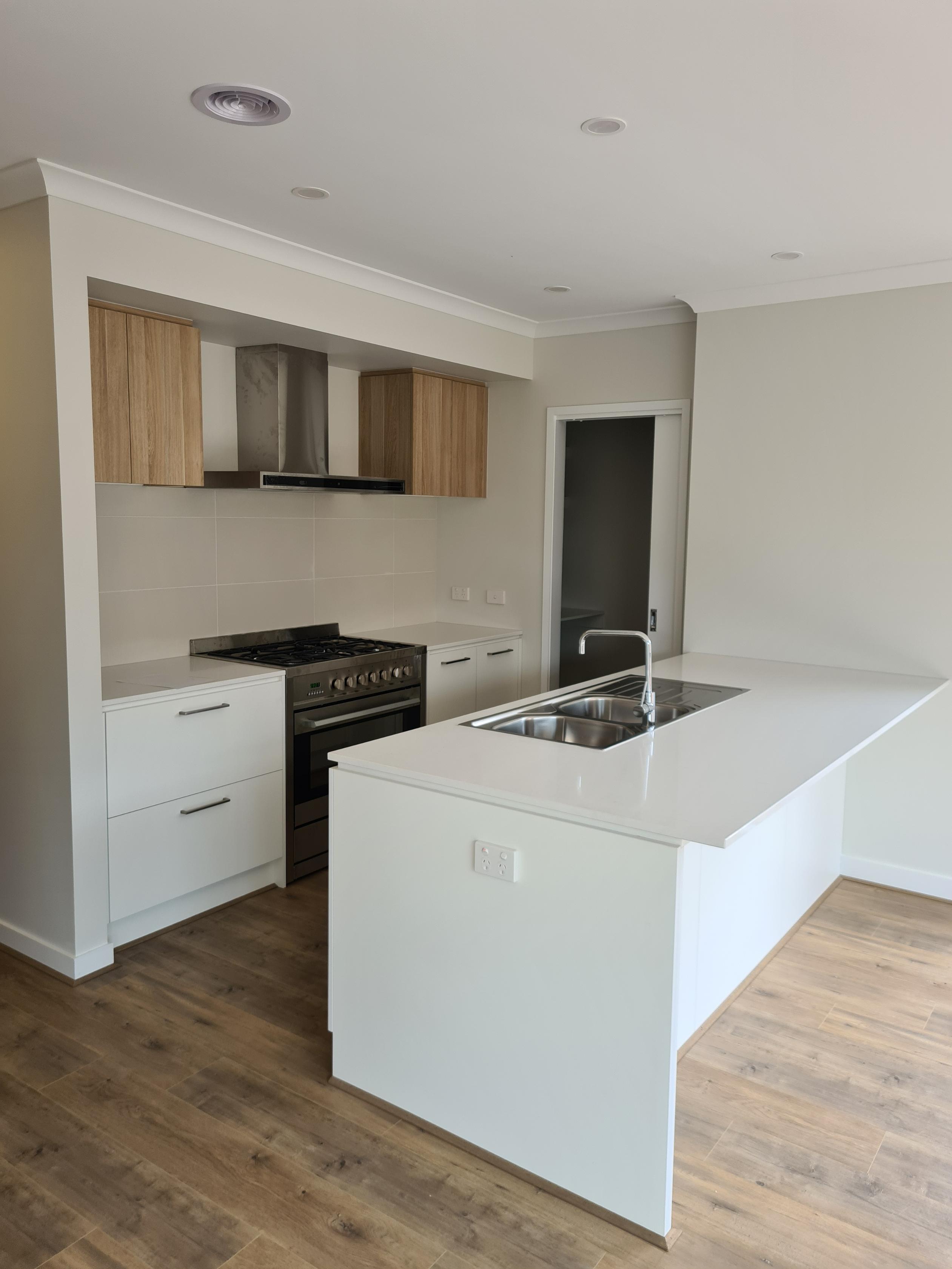 Kitchen is complete with 900mm stainless steel appliances and stone benchtop, dishwasher, microwave and pantry space