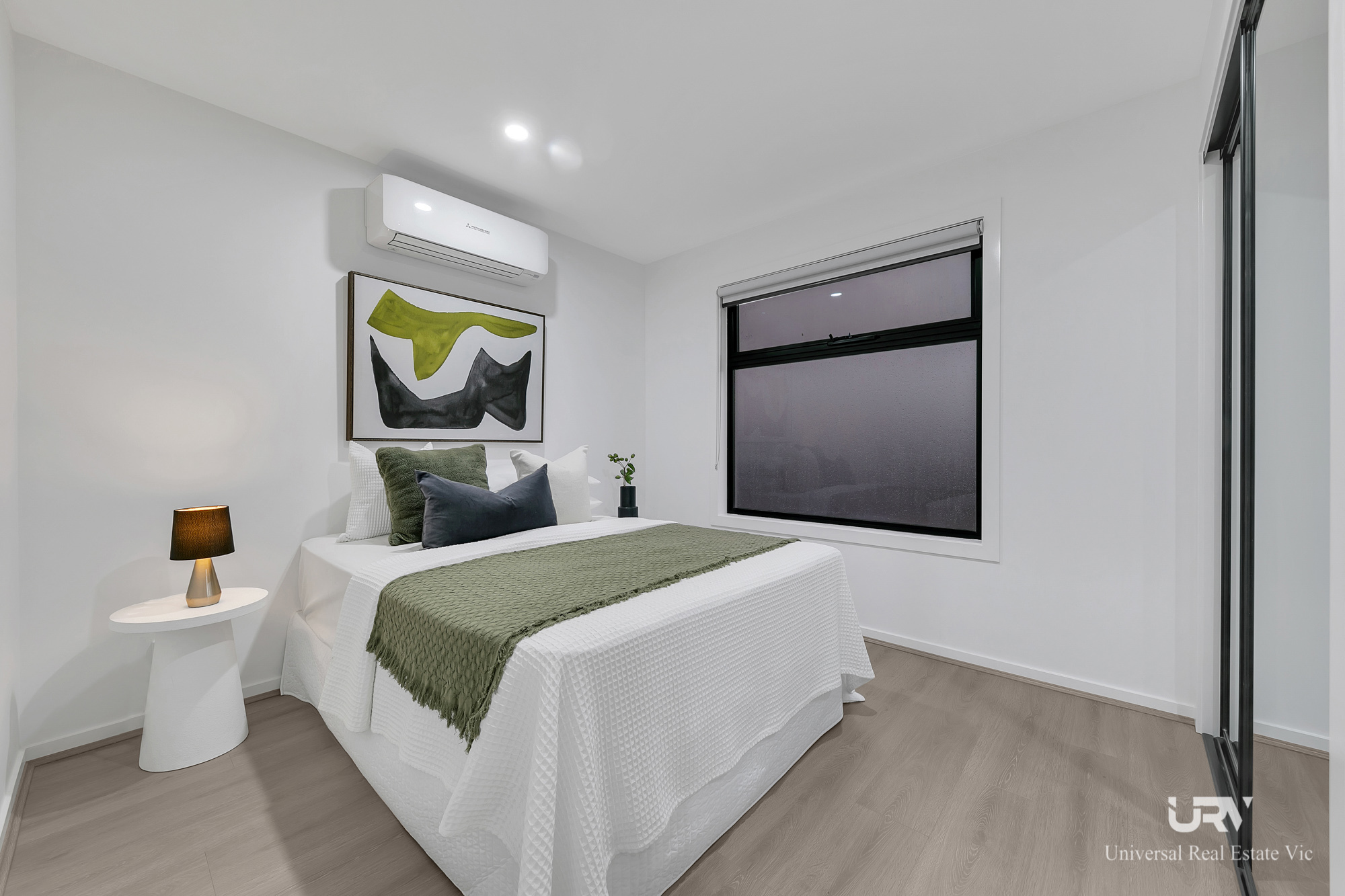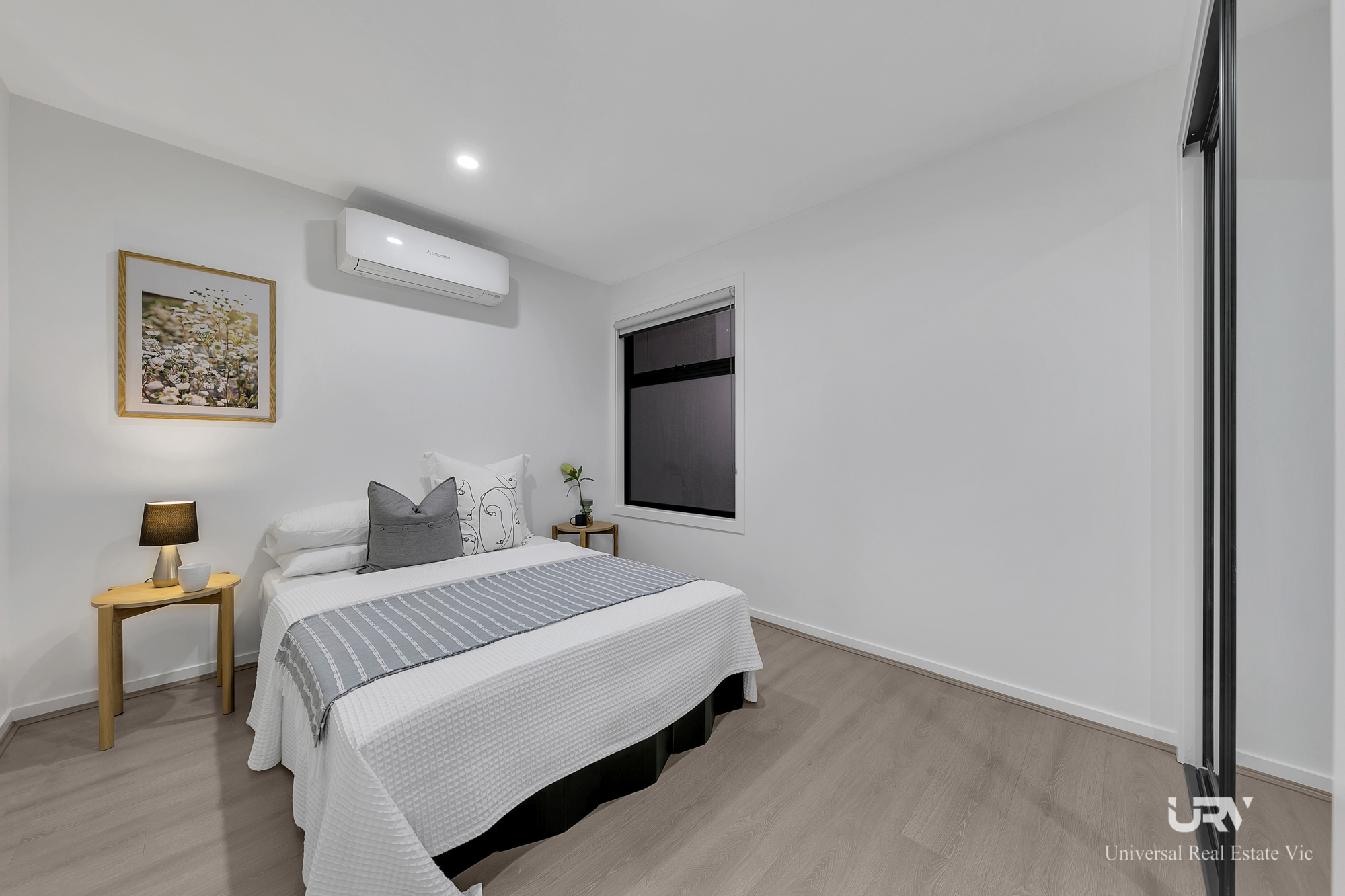 The home features three generously sized bedrooms, including a master suite with a walk-in robe and a luxurious ensuite. Each bedroom and the living space are equipped with a split air conditioning system for hearting and cooling, ensuring year-round comfort. The bathrooms are adorned with wall-to-wall tiles, and double blinds on major windows provide both privacy and style. Additional features include a security alarm system, an intercom, extra storage facilities, and a convenient powder room on the ground floor.
