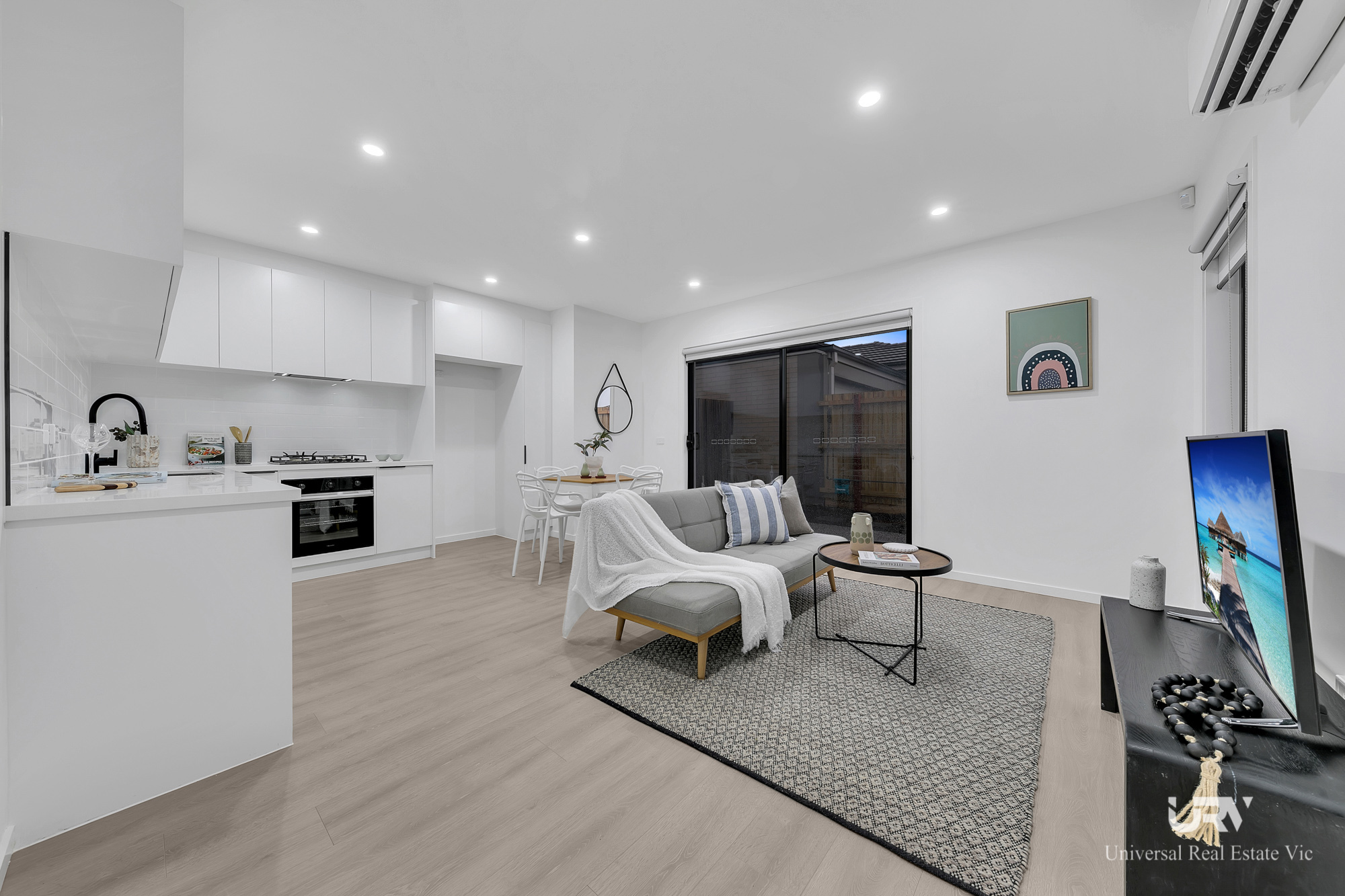 Step inside to discover an open and airy floor plan anchored by a gourmet kitchen. The kitchen showcases a dining island, smooth stone surfaces, custom cabinetry, and high-end black appliances, making it a haven for culinary enthusiasts. The spacious living area, adorned with extra light fittings, offers a perfect setting for family gatherings or entertaining guests. The exterior is equally impressive with exposed aggregate concrete, enhancing the home's curb appeal.