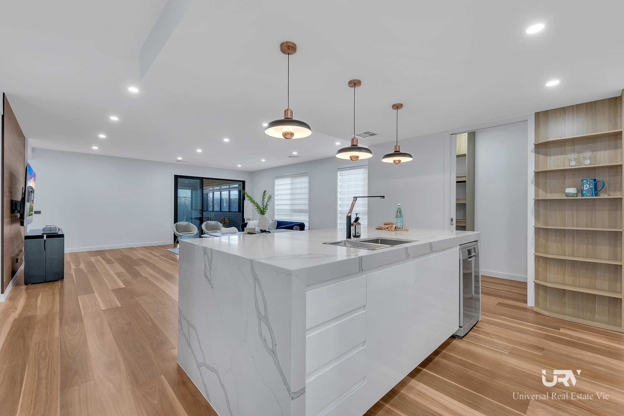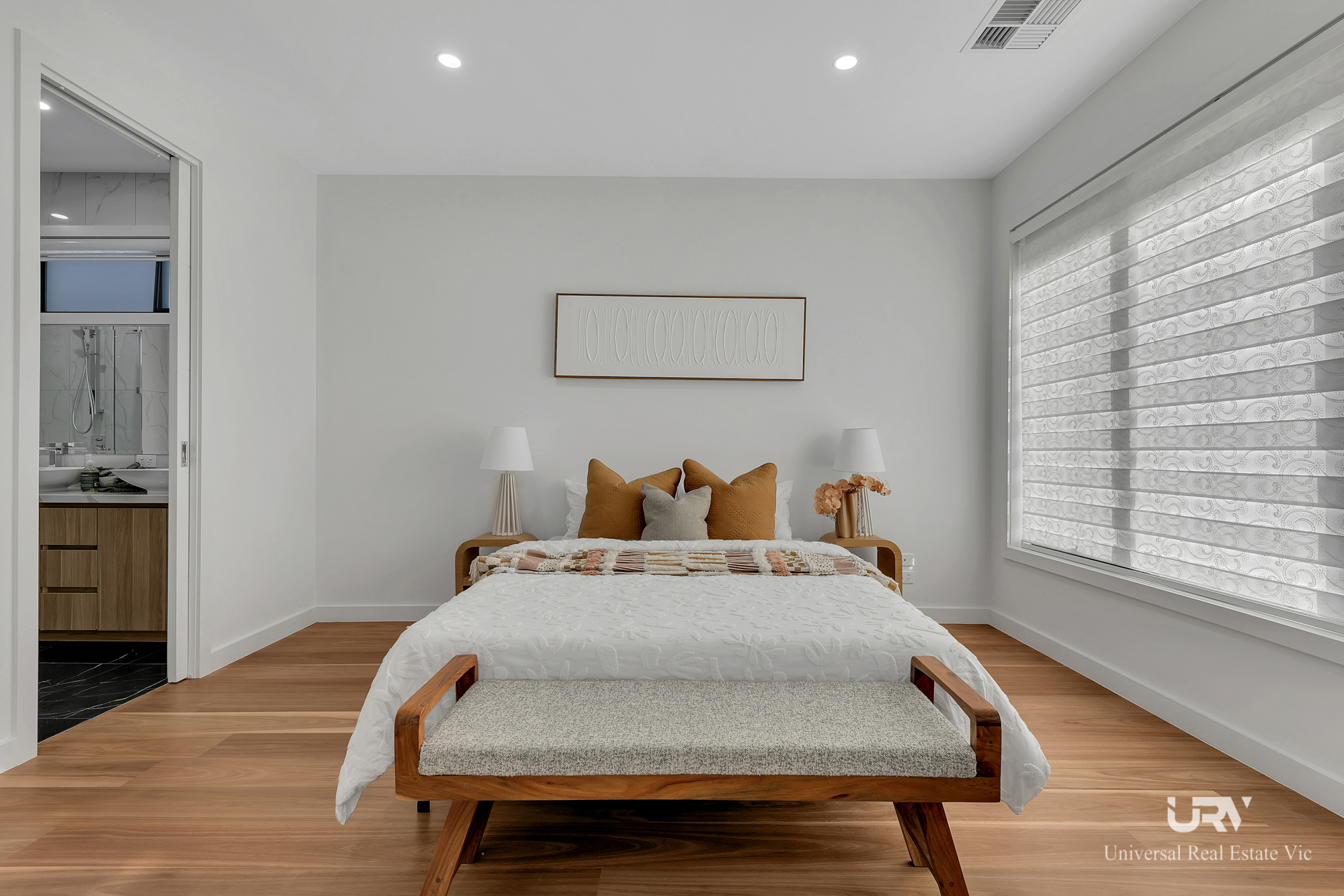 As you enter, you'll be captivated by the open-plan living area, accentuated by light wood features that create a warm and inviting atmosphere. The master suite offers a luxurious retreat with a walk-in wardrobe featuring ample shelving and storage, as well as an opulent ensuite with double basins and wall-to-wall tiling.