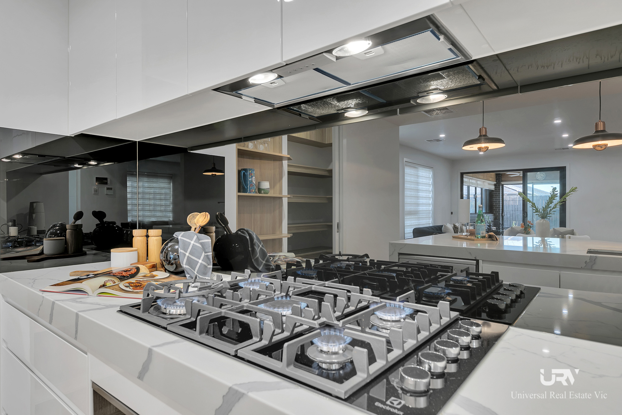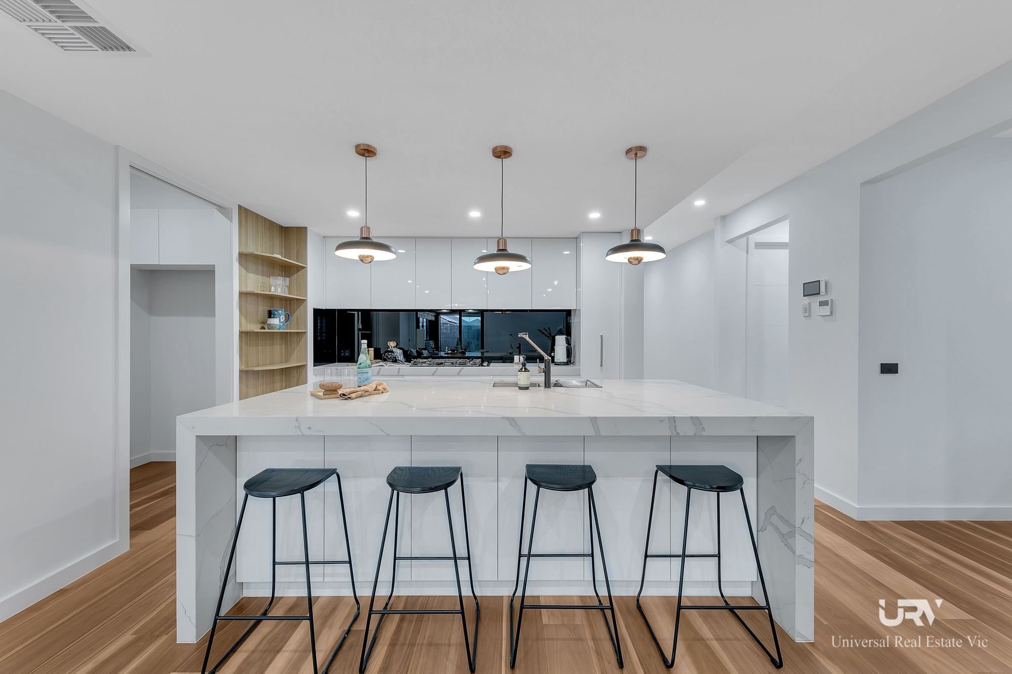 The kitchen is a chef's dream, centered around a marble island benchtop and equipped with stainless steel appliances. The adjacent butler's pantry provides extensive storage, making it both practical and stylish. The home's consistent wooden interior design ties together the various spaces, creating a seamless flow throughout.