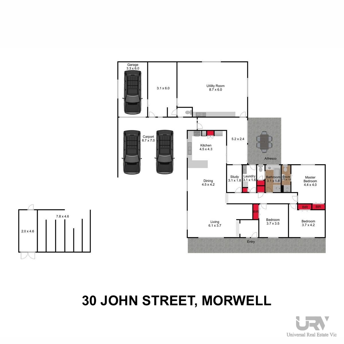 Garage: Double carport with additional shedding for storage or workshop use.