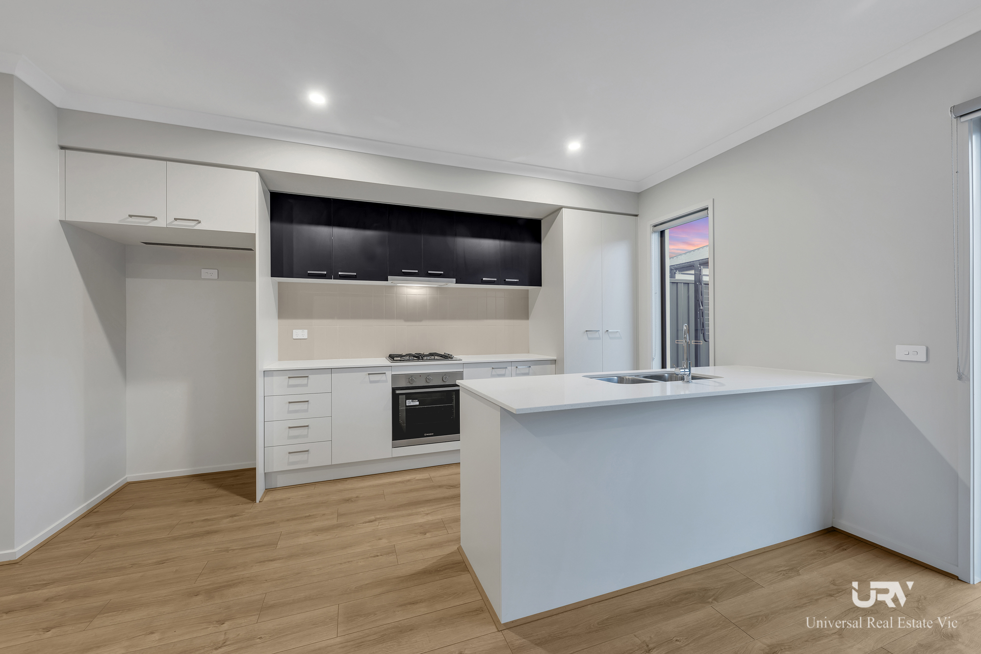 Modern kitchen with stainless steel appliances and ample bench space