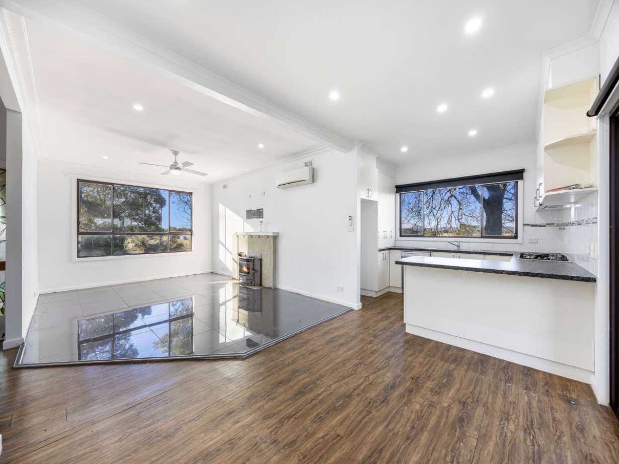 -Updated kitchen overlooking the formal lounge room, equipped with solid fuel heating and a split system for year-round comfort.
