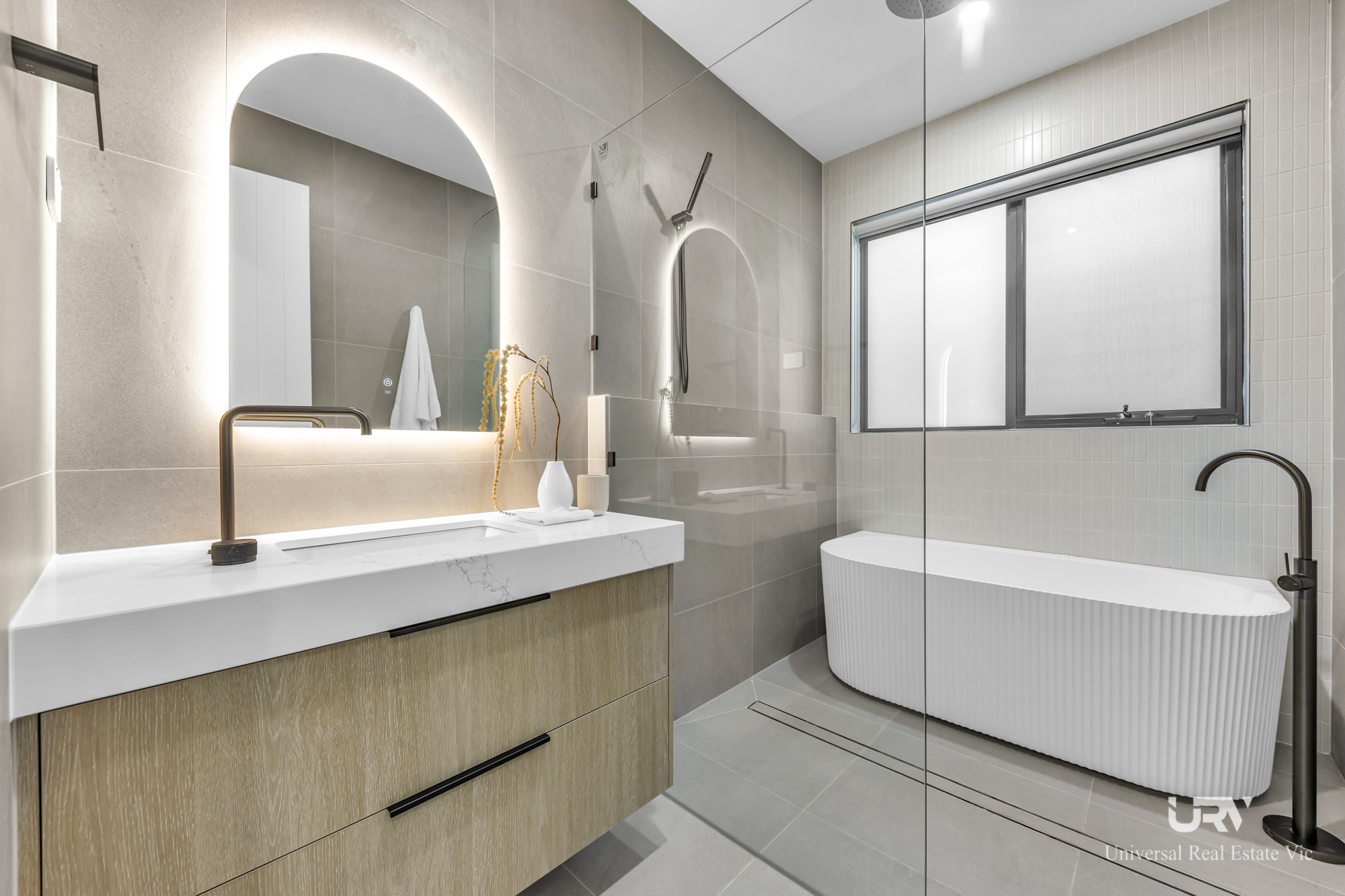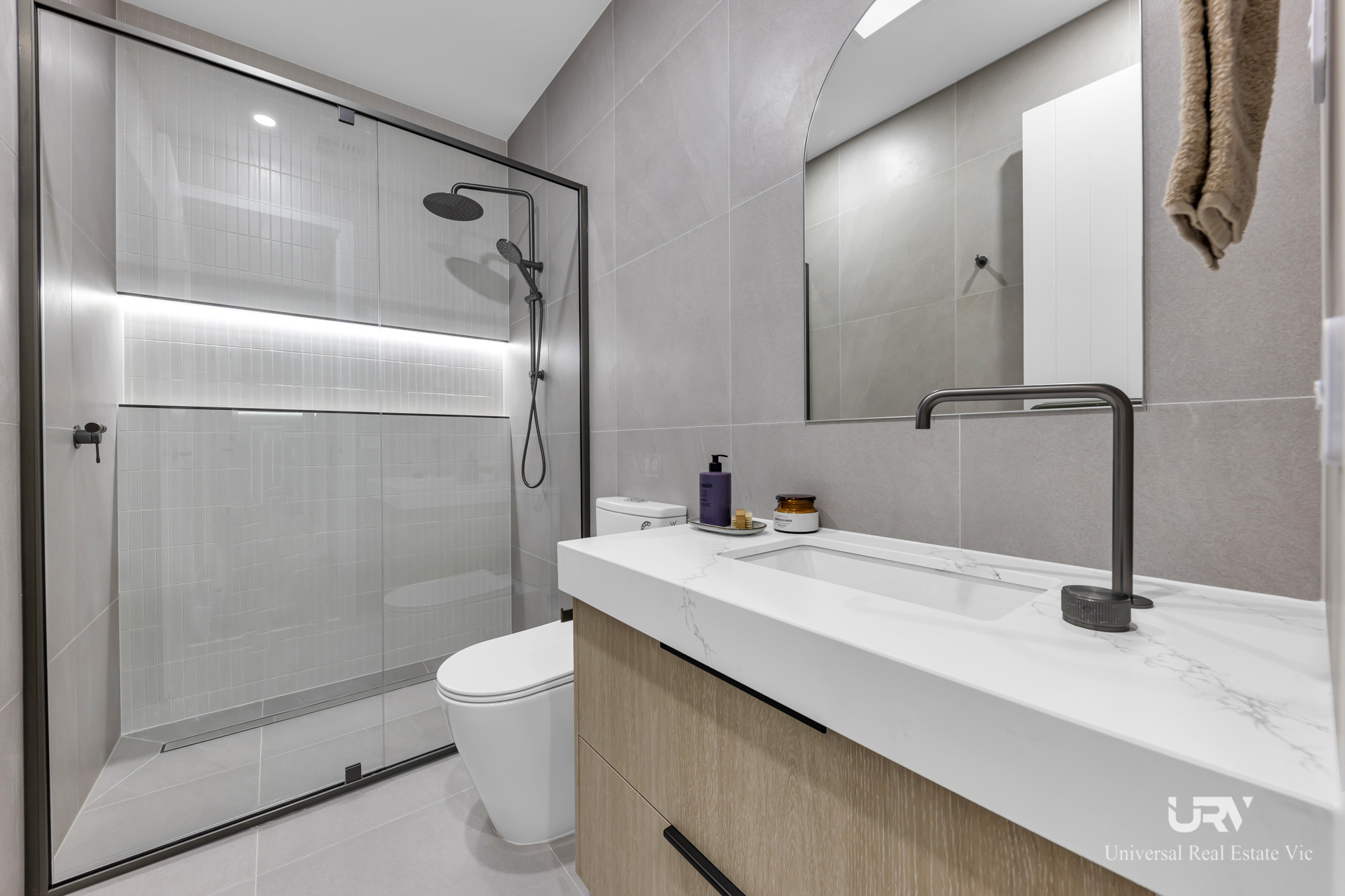 This residence truly stands out with two generous master bedrooms, each complete with its own ensuite and walk-in robe. The main master suite offers added luxury with a double vanity and an oversized shower, providing the perfect private retreat. The two remaining bedrooms come fitted with built-in robes and are serviced by a central bathroom with a full-size bathtub and floor-to-ceiling matte finish tiles. A separate powder room is ideal for guests and family use.
