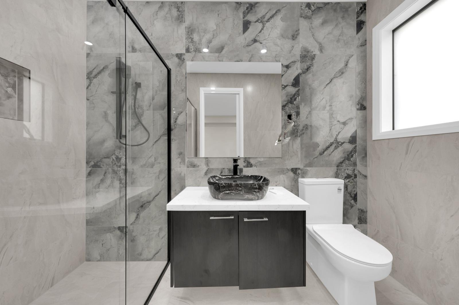 The designer kitchen forms the heart of the residence, seamlessly blending elegance with everyday practicality. A stone island bench with waterfall edges takes center stage, complemented by sleek black cabinetry, timber overhead cupboards, and a full butler's pantry. A long picture window splash back enhances the space with natural light and architectural flair. Equipped with quality 900mm stainless steel appliances and abundant preparation space, this kitchen is both a showpiece for entertaining and a highly functional hub for family life.