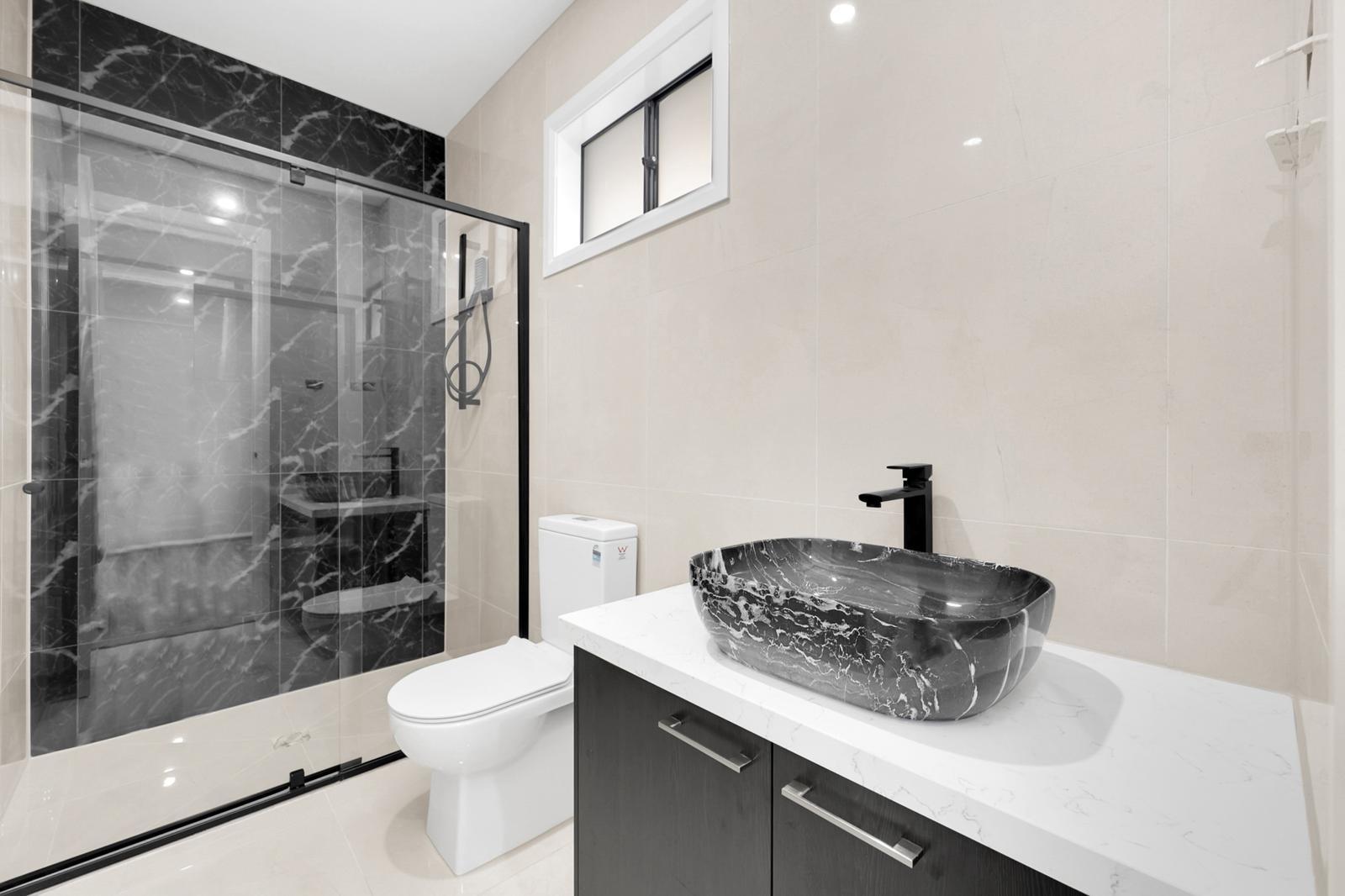 Adjoining the kitchen, the open-plan meals and living area creates a spacious environment for relaxed family living. Sliding doors connect the indoors to the outdoor entertaining space, perfect for hosting gatherings or enjoying quiet weekends in the landscaped backyard.