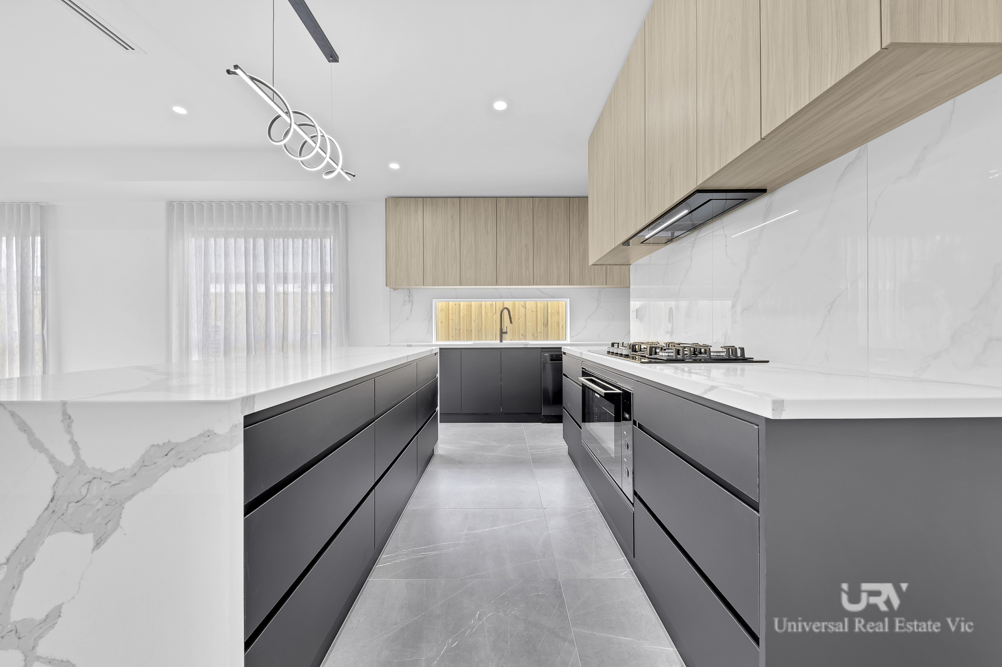 Designer kitchen with stone benchtops, premium stainless-steel appliances and ample storage